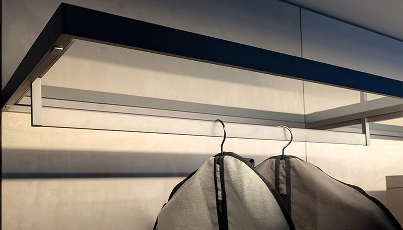 Illuminate your closet with energy-efficient LED lighting, available as an optional integration into ready-made aluminum shelves or recessed into your wooden shelves. Perfectly highlights contents and adds a luxurious ambiance to your closet.